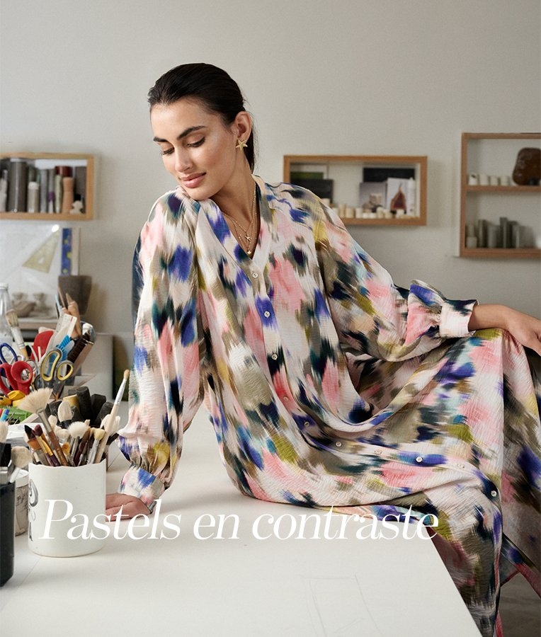 Des tons doux et chauds inspirés de la nature—jaune vanille, ocre, beige et gris pierre—irradient lumière, calme et chaleur subtile. Les tissus sont soigneusement choisis : dentelle, matières brillantes et textures fluides apportent une touche sophistiquée aux silhouettes amples et confortables. Le contraste entre des tissus luxueux et des formes décontractées crée une allure moderne, féminine et aérienne.